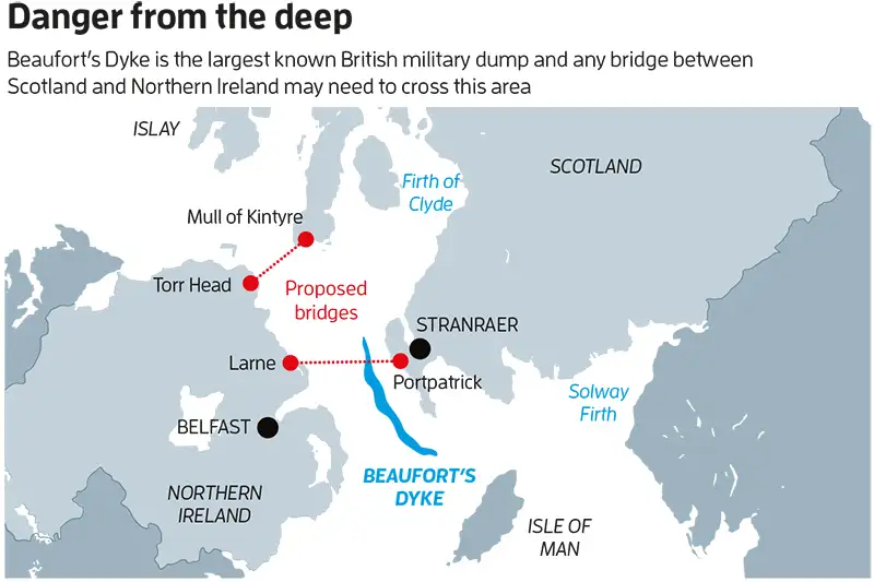 The contaminated zones around Beaufort's Dyke would necessitate either the world's largest maritime cleanup operation or revolutionary tunnelling techniques to pass safely beneath the contamination layer. Norwegian engineers have suggested adapting their floating tunnel technology, using 500-metre deep tension cables to suspend tunnel sections above the most problematic areas of seabed.